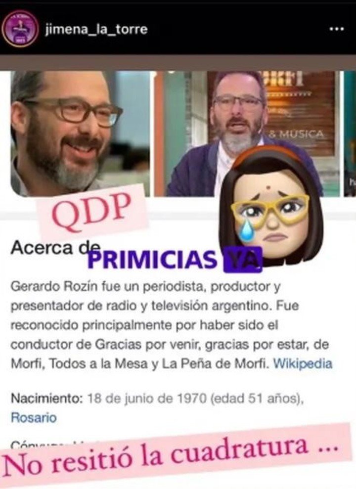 "No resistió la cuadratura", escribió La Torre en su cuenta de Instagram junto a una foto de Rozín y datos de su página en Wikipedia que el sitio Primicias Ya logró capturar antes de que ella la borrara. A eso, además, la también panelista y escritora le sumó un emoji de una mujer llorando y la frase "Que descanse en paz".
