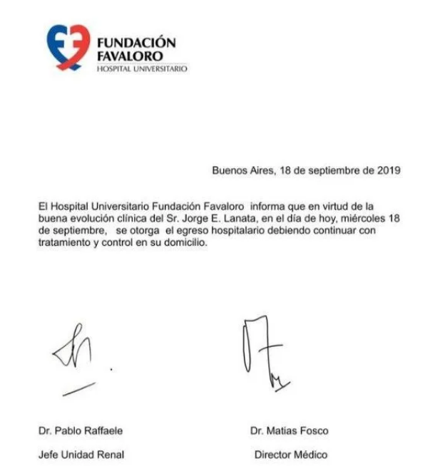 "El Hospital Universitario Fundación Favaloro informa que en virtud de la buena evolución clínica de Jorge E. Lanata, en el día de hoy, 18 de septiembre, se otorga el egreso hospitalario debiendo continuar con el tratamiento y control en su domicilio", comunicó la Fundación.