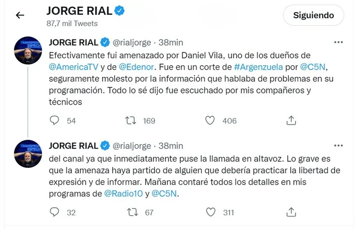 "Efectivamente fui amenazado por Daniel Vila, uno de los dueños de @AmericaTV y de @Edenor. Fue en un corte de #Argenzuela por @C5N , seguramente molesto por la información que hablaba de problemas en su programación. Todo lo sé dijo fue escuchado por mis compañeros y técnicos del canal ya que inmediatamente puse la llamada en altavoz.", escribió el conductor.