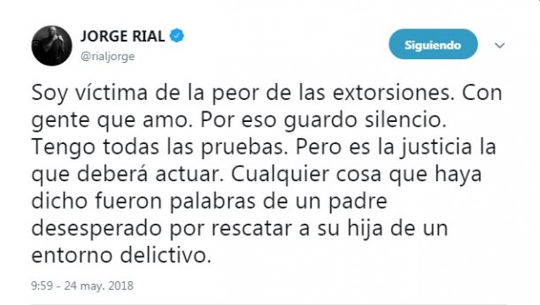 “Soy víctima de la peor de las extorsiones. Con gente que amo. Por eso guardo silencio. Tengo todas las pruebas. Pero es la justicia la que deberá actuar”, expresó Rial en un tuit en el que también agregó que “cualquier cosa que haya dicho fueron palabras de un padre desesperado por rescatar a su hija de un entorno delictivo".