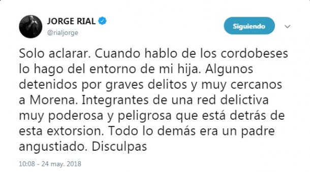 Además, en otra publicación "aclaró" sus dichos contra la provincia de Córdoba: “Cuando hablo de los cordobeses lo hago del entorno de mi hija. Algunos detenidos por graves delitos y muy cercanos a Morena. Integrantes de una red delictiva muy poderosa y peligrosa que está detrás de esta extorsión. Todo lo demás era un padre angustiado. Disculpas”.