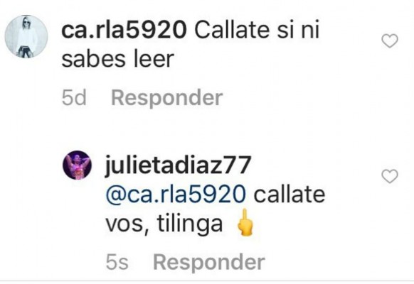 En ese posteo, ella mostraba el comentario de una seguidora que le ponía: "Callate si ni sabés leer"; y su respuesta que era: "Callate vos, tilinga".