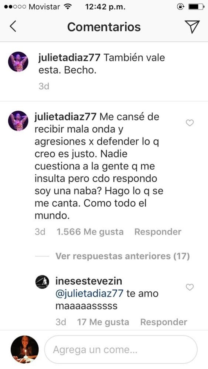Es más, en uno de los comentarios de la segunda captura de pantalla que la artista compartió, ella misma aclaró los motivos de su comportamiento. “Me cansé de recibir mala onda y agresiones por defender lo que creo que es justo (en clara referencia a la despenalización del aborto)", comenzó diciendo Julieta.