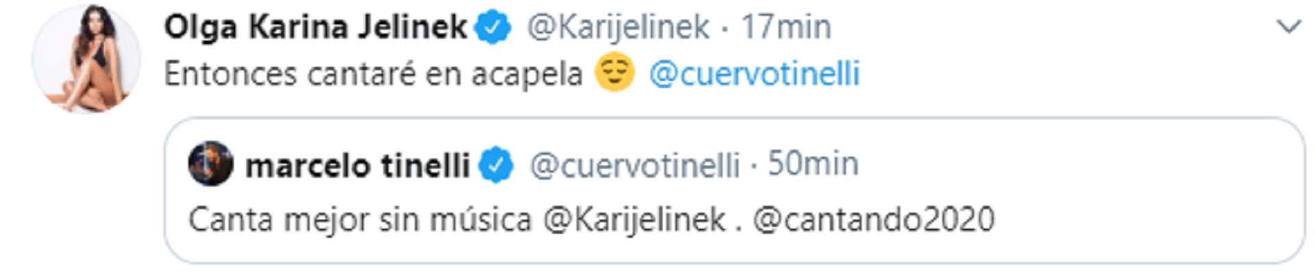 En tanto, desde las redes sociales, Marcelo Tinelli también se involucró en la devolución que el jurado le hizo a la participante y remarcó: “Karina Jelinek cantá mejor sin música”. El tuit salió publicado luego de que la modelo entonara a capela el tema que había cantado minutos antes durante su performance para demostrar que no “desafinaba”, tal como se lo había hecho notar Nacha Guevara y Karina La Princesita.