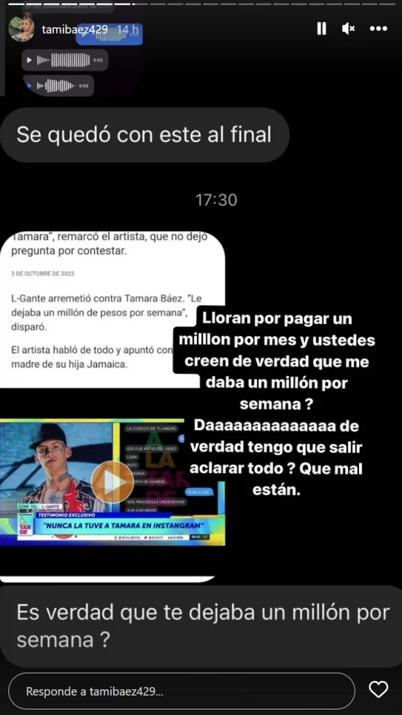 Con firmeza, Tamara Báez desmintió que su expareja, L-Gante, le pasaba un millón de pesos por semana para que afrontara sus gastos.