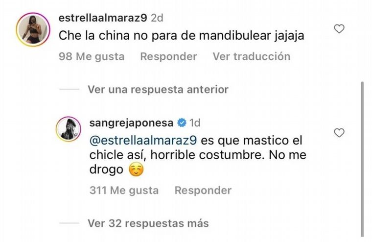 Para cortar con los comentarios, la actriz le respondió a una de las tantas usuarias que la criticó con un reiterativo “che, la China no para de mandibulear”. “Es que mastico el chicle así, horrible costumbre. No me drogo”, fue la réplica.