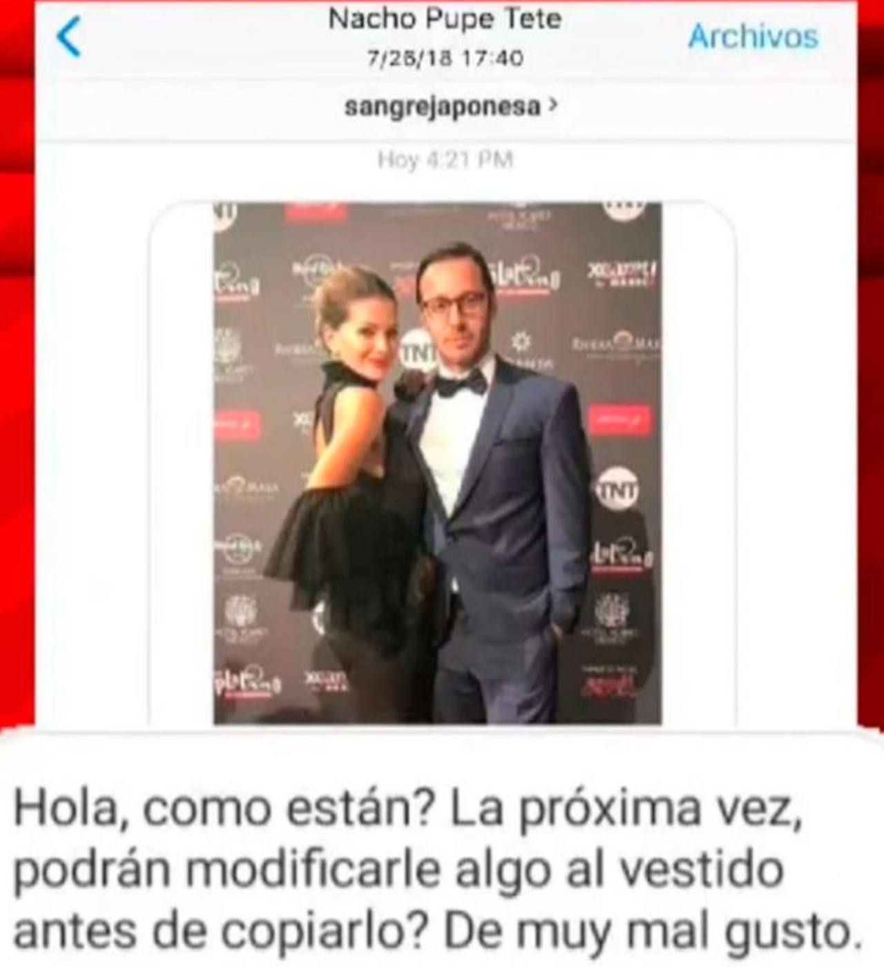 La actriz había usado la prenda en la entrega de los Premios Platino a fines de abril en México. "Hola, ¿cómo están? ¿La próxima vez podrían modificarle algo al vestido antes de copiarlo? De muy mal gusto", le reprochó a la marca Pupe Tete.