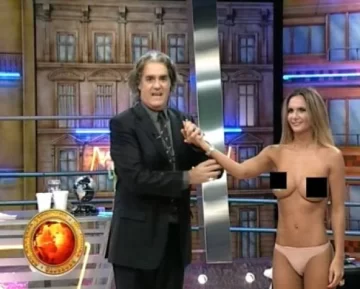 No suficiente con el impacto que produjeron sus -al menos- curiosos invitados, el miércoles por la noche Roberto Pettinato tuvo una idea de aquellas. Sentados en su living un grupo de nudistas, le pidió a su bien dotada panelista -Amalia Granata- que les hiciera los honores. Y lejos de ruborizarse, la rubia (ex del Ogro Fabbiani, con quien tuvo a su hijita Uma) peló trapos y se quedó como Dios la trajo al mundo… bueno, con una tanguita. Precavido, el canal (América) se encargó de poner unas banditas negras para que no se le vieran, tampoco a ella, esas partes íntimas que la muchacha -que se hizo famosa por un supuesto affaire con Robbie Williams- no tuvo reparo en mostrar.