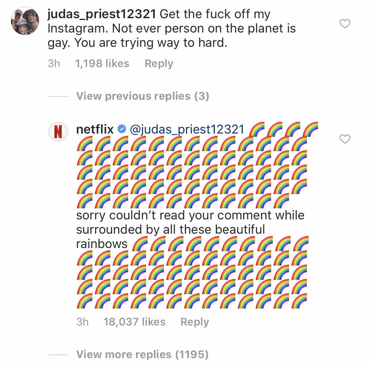 A lo que Netflix respondió: “Lo siento, no pudimos leer tu comentario rodeados como estamos de todos estos preciosos arcoíris”.
