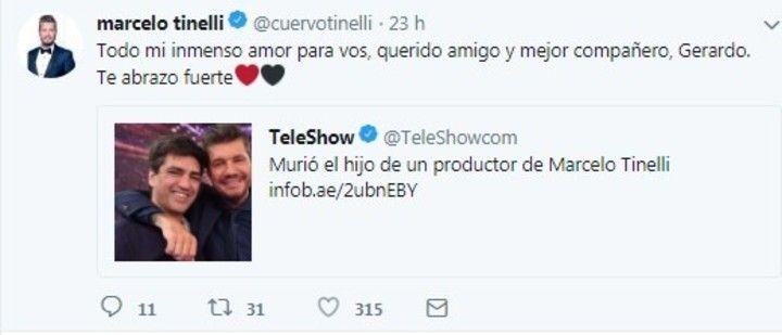 Tras enterarse de la dolorosa e impactante noticia, Marcelo Tinelli le expresó a Folgueira todo su apoyo a través de las redes. “Todo mi inmenso amor para vos, querido amigo y mejor compañero, Gerardo. Te abrazo fuerte”, escribió.