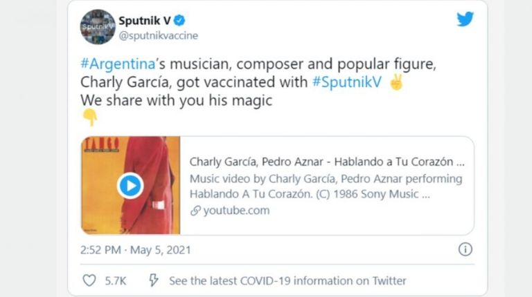 "El músico, compositor y figura popular de la Argentina, Charly García, se vacunó con Sputnik V. Compartimos contigo su magia", señalaron en el Twitter, añadiendo la canción Hablando a tu corazón, un clásico que compuso García con Pedro Aznar, en 1986.