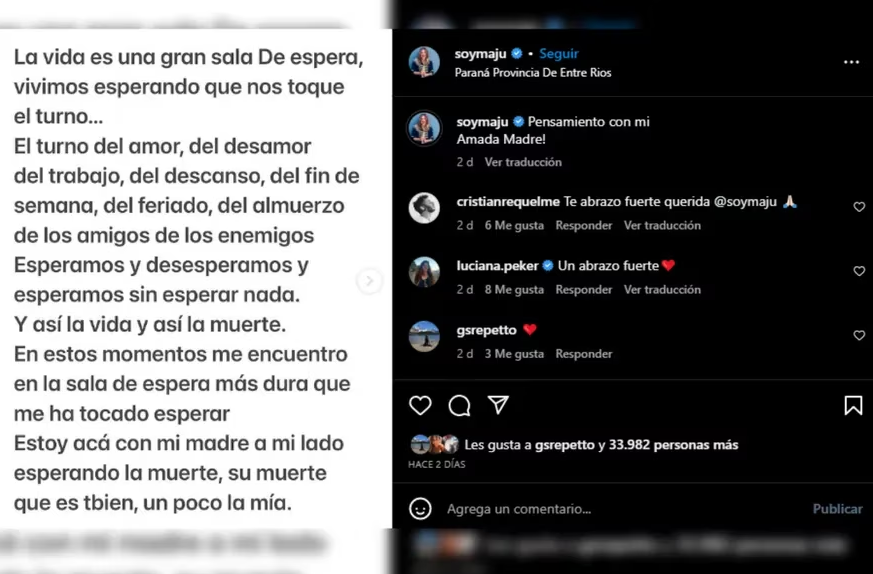 El lunes por la tarde, a dos días de su carta, Maju compartió un video de hace un tiempo en donde se ve a Ana María muy alegre rodeada de gente. “Ahora si mamita, a bailar en paz. Te amo con toda mi alma”, escribió para darle el último adiós en redes sociales.