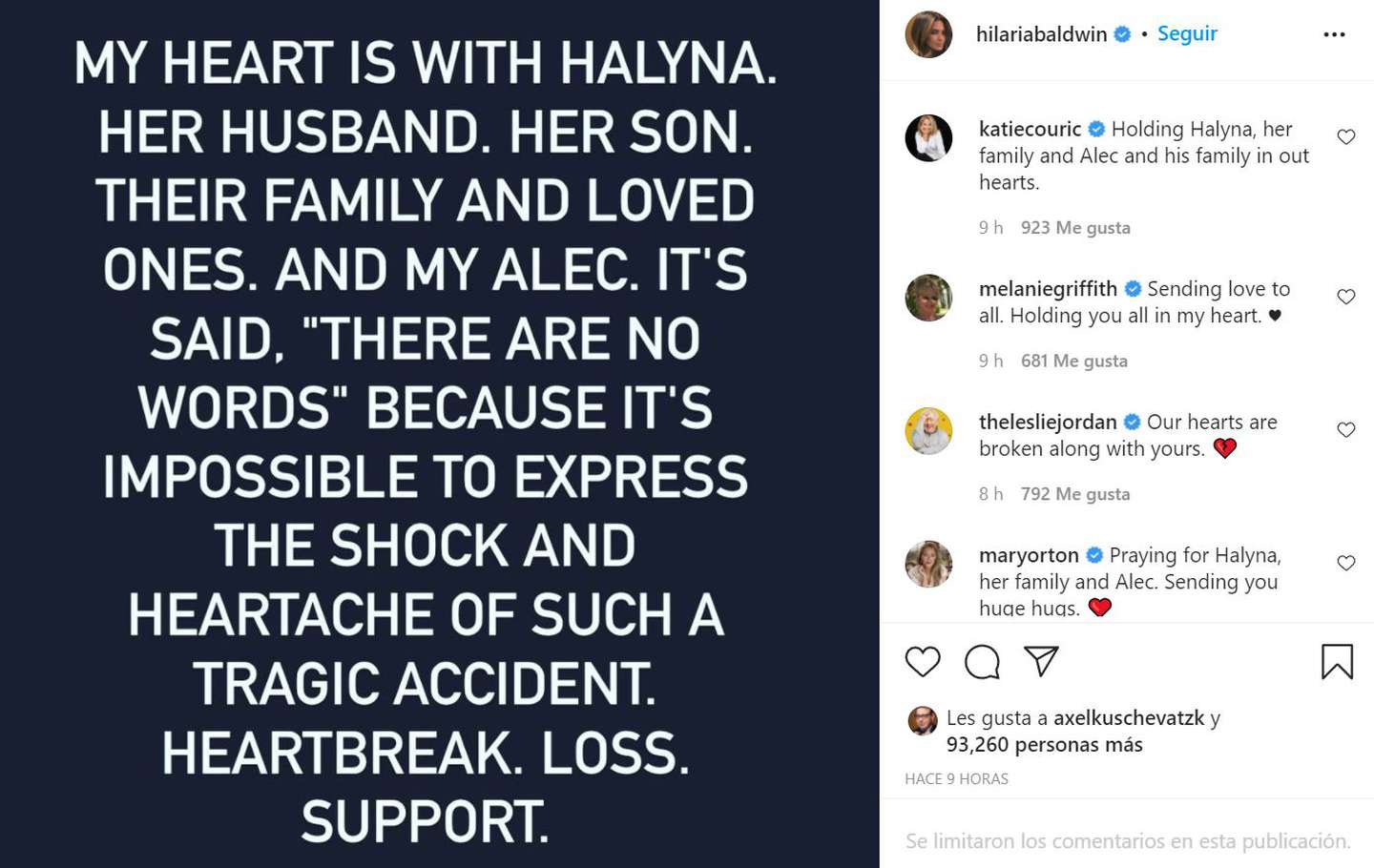 “Mi corazón está con Halyna, su marido, su hijo, su familia y sus seres queridos. Y con mi Alec”, escribió la mujer que es instructora de yoga. Y completó: “Se dice que ‘no hay palabras’ porque es imposible de expresar el shock y la tristeza que generan un accidente tan trágico. Corazón roto. Pérdida. Apoyo”.