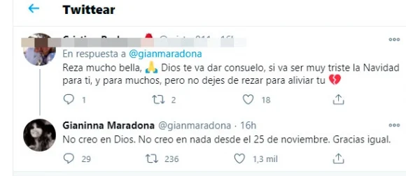 Atenta al dolor y a la bronca de la hija de Maradona, una usuaria de Twitter le respondió: "Rezá mucho, bella. Dios te va a dar consuelo. Sí va a ser muy triste la Navidad para ti y para muchos, pero no dejes de rezar para aliviar tu corazón roto".