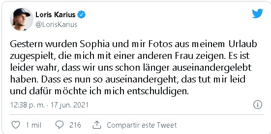 “A Sophia y a mí nos filtraron fotos de mis vacaciones que me muestran con otra mujer. Lamentablemente, es cierto que nos hemos distanciado mucho tiempo. Lamento que ahora se esté derrumbando y me gustaría disculparme por ello”, escribió el actual integrante del Liverpool, quien está casado con la famosa actriz y presentadora alemana, Sophia Thomalla.