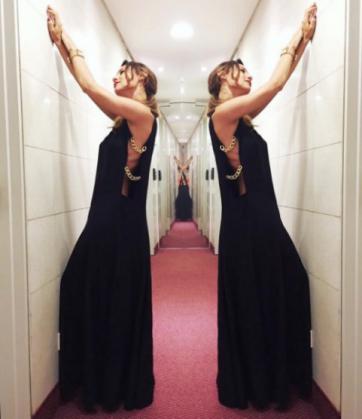 La foto fue tomada en la previa de Showmatch 2016, donde la modelo forma parte del jurado oficial. Allí lució un vestido largo negro de la marca de ropa de Micaela Tinelli. Sin embargo, las aberturas de la prenda a los costados del cuerpo dejaron ver una imagen poco agradable: las costillas de Pampita.