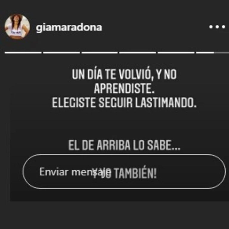 Gianinna Maradona vio este material y realizó un descargo en sus historias de Instagram. De esta manera, expresó su dolor por ver a su papá en esa situación y contó que decidió tener una charla sobre este tema con su hijo, Benjamín, fruto de su relación con el Kun Agüero.