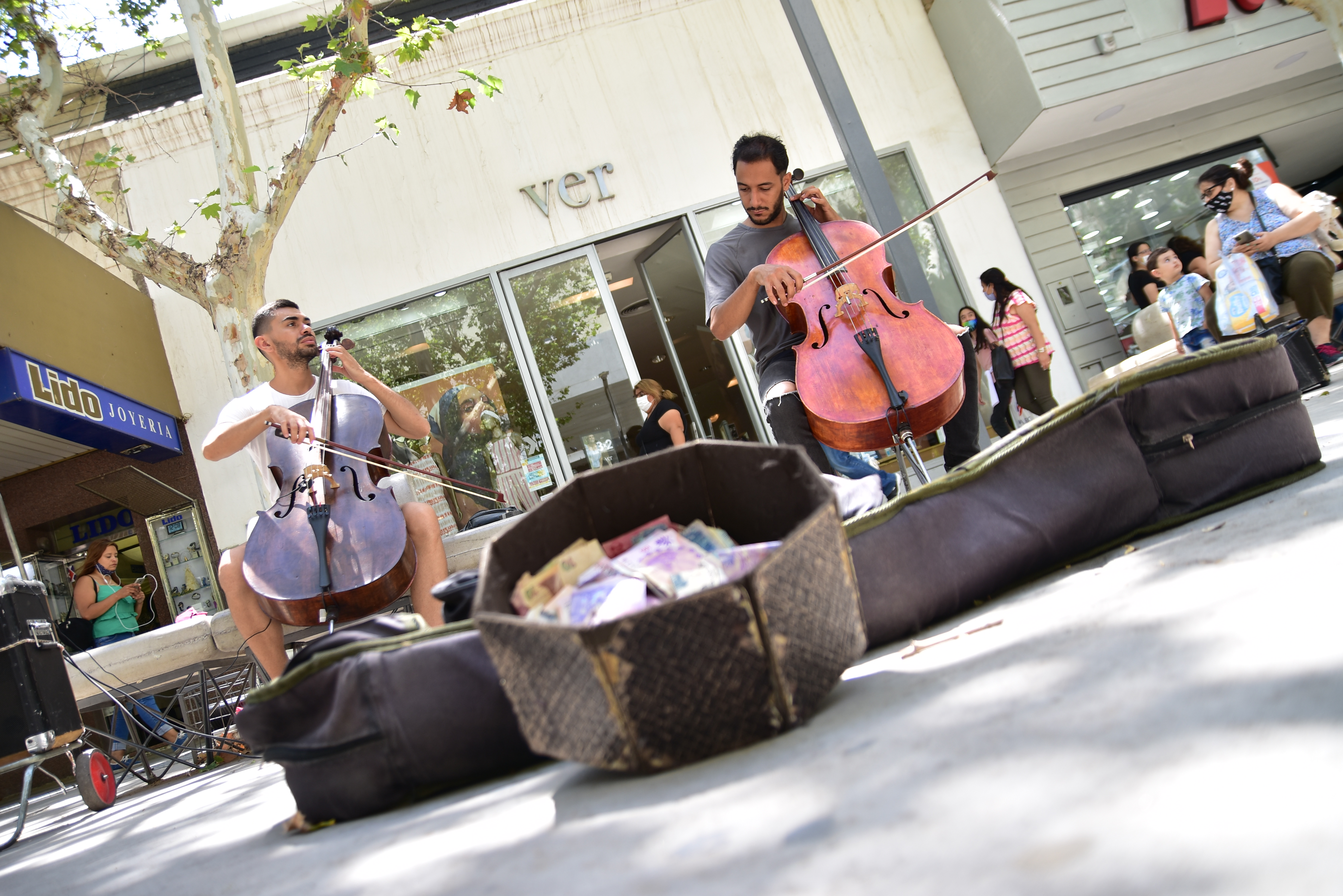 Samuel y Germán, por su parte, son chelistas que se sumaron hace menos de 3 años. El primero viene de la Escuela de Música de la UNSJ y el segundo, es oriundo de Venezuela y formado durante 11 años en el sistema de orquestas infantiles y juveniles. Ambos dan clases particulares y son profesores en el Instituto Santa Cecilia y en la Orquesta Escuela, respectivamente. Además de ser grandes amigos, son compañeros de banco. "La pandemia nos cambió las reglas. Tuvimos que lidiar al principio con las habilitaciones, pero con lucha e insistencia logramos que nos acompañe Mariano Graffigna de Turismo y Cultura para recuperar el espacio", señaló Germán. Por su parte, el chelista Samuel contó que a ello se sumaron otros frentes abiertos: "A algunos comerciantes no les gustaba que tocáramos otra vez y ponían el volumen de sus equipos de sonido más fuerte, que nos interrumpían para tocar; y por otro lado fueron llegando nuevos músicos y había que ponerse de acuerdo, establecer un código entre nosotros y respetar los lugares", relató. No obstante, el tiempo fue acomodando de a poco las cosas en sus lugar y las tensiones, habituales en un espacio pequeño, se fueron conteniendo un poco mejor. "Hoy estamos gracias a la lucha que durante años Grillo hizo para que los artistas callejeros sean reconocidos", afirmó Samuel. En este sentido, Cárdenas dejó en claro que "hay gente que cree que nuestra labor es de caridad o es un capricho, pero nosotros cantamos para alegrar al pueblo. Procuramos que en este espacio público haya un nivel digno para que todos puedan disfrutar del arte".