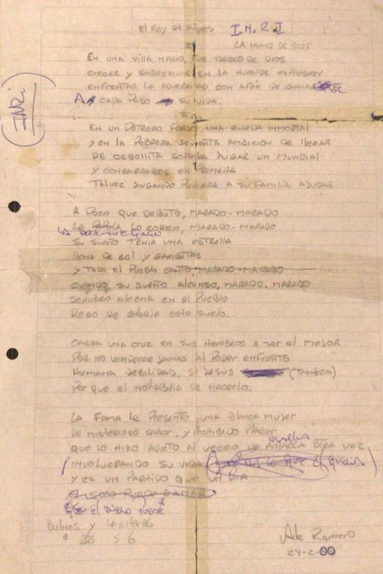 En diálogo con el canal El Doce de Córdoba, Alejandro contó que Rodrigo improvisó un título, La Mano de Dios, y al costado de la hoja, tal como se puede observar en la imagen, escribió con lapicera I.N.R.I., la siglas que habrían sido escritas en la cruz en la que yacía Jesucristo, por orden de Poncio Pilato. Y reveló un detalle que en aquel momento pasó desapercibido, pero que visto en retrospectiva cobra otro valor: “En un momento Rodrigo se queda pausado y me dice: ‘Me cagaste. Este va a ser mi último éxito’”.