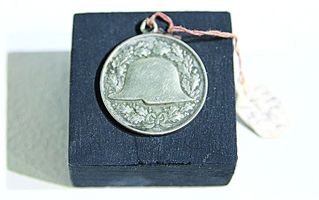 Testimonio. Medalla de Alemania de la Primera Guerra Mundial. En el anverso se encuentra un casco del uniforme y en el reverso una estrofa del himno alemán.