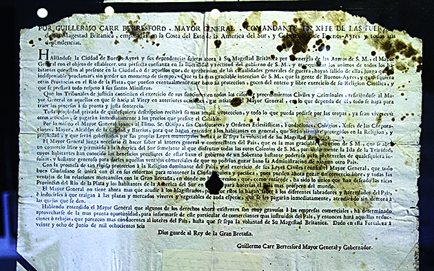 Proclama de Guillermo Carr Beresford. Comunicado del 28 de junio de 1806, día después de la toma del Gobierno de Buenos Aires que anuncia disposiciones del Rey de Gran Bretaña.