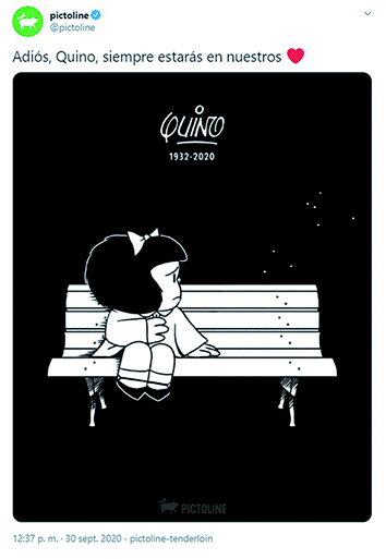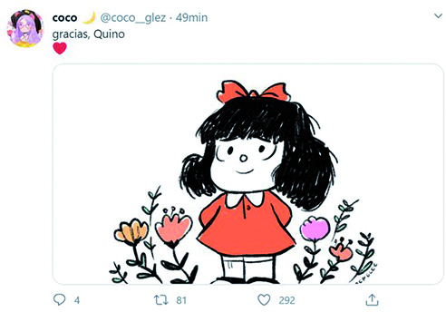 Las redes fueron el lugar para recordar al querido Quino. Artistas, políticos, medios de comunicación e instituciones de Argentina, Latinoamérica y España publicaron mensajes de despedida. Twitter incluso se llenó de viñetas publicadas por la gente, por sus seguidores, y eso hizo que encabezara la tendencia en Twitter. En Buenos Aires, las esculturas de Mafalda, Felipe y Susanita de San Telmo comenzaron a cubrirse de flores (foto). Algunos de los mensajes.