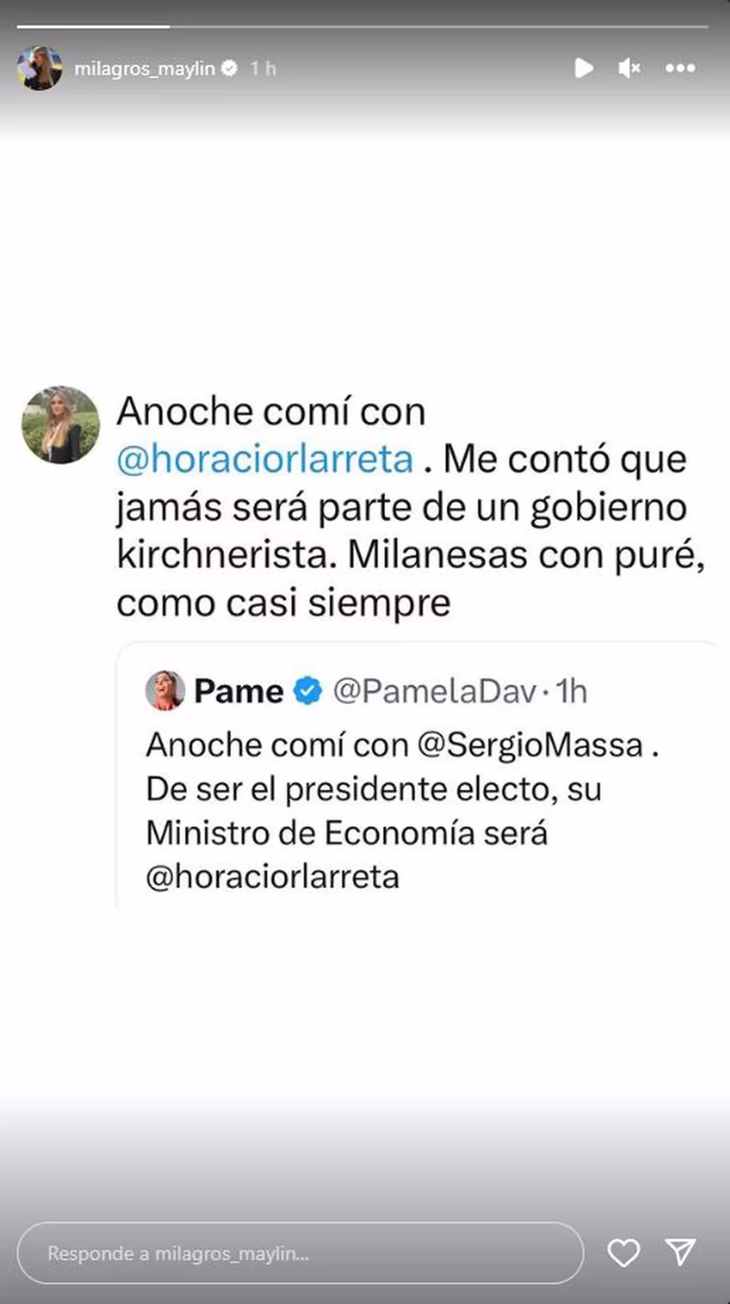 Pamela David dejó en shock a sus seguidores con un tuit que generó mucho ruido. Contó que el sábado cenó con Sergio Massa y que él le comentó que Horacio Rodríguez Larreta sería su ministro de economía en caso de ganar el balotaje. Sin embargo, el propio jefe de gobierno porteño salió a desmentir la información y ahora se sumó su novia, Milagros Maylin, que chicaneó a la modelo.