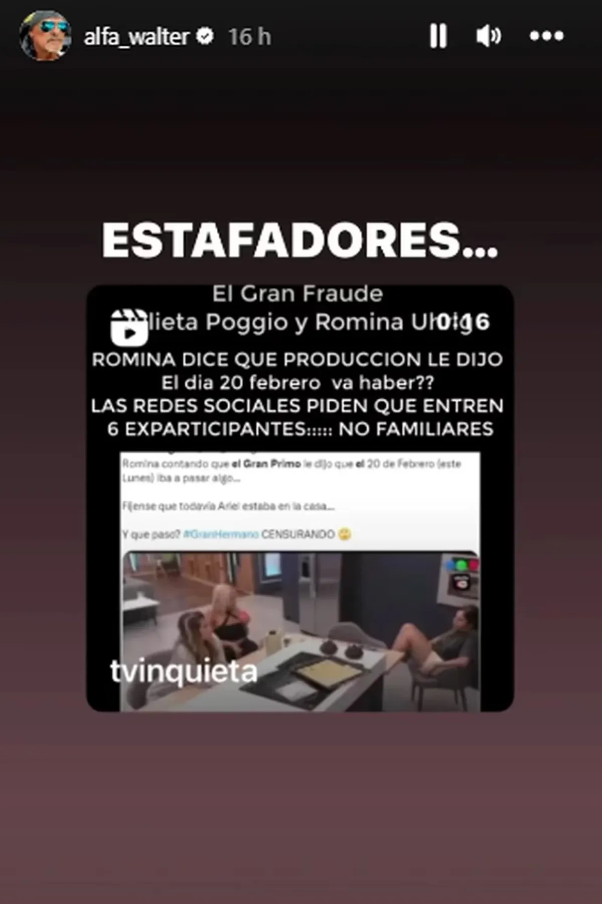 Ante esto, Alfa denunció a la producción de Gran Hermano 2022 de tener acomodadas a Julieta y a Romina dentro de la casa e hizo un tremendo descargo en sus Stories de Instagram: "Estafadores…", escribió el ex participante.