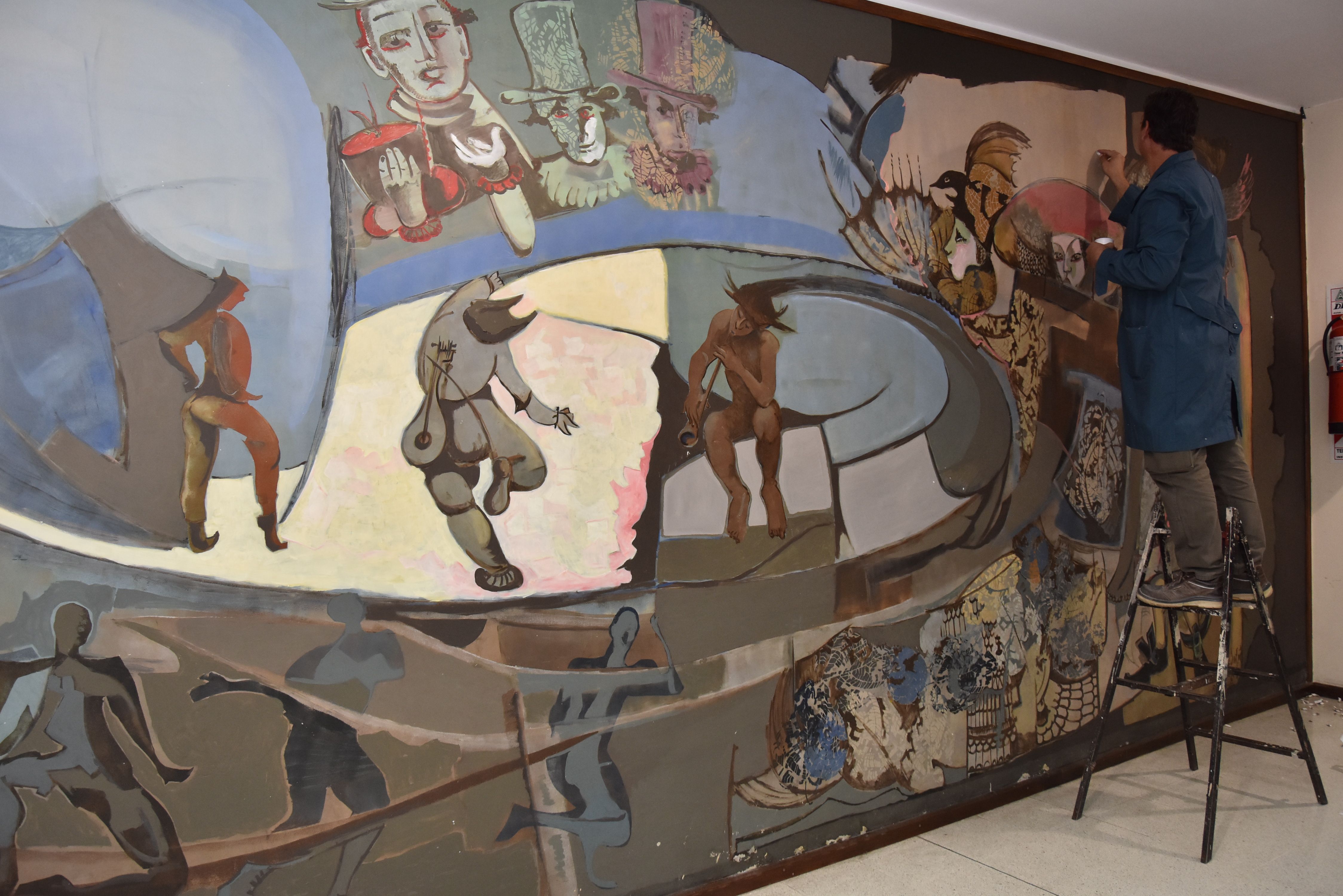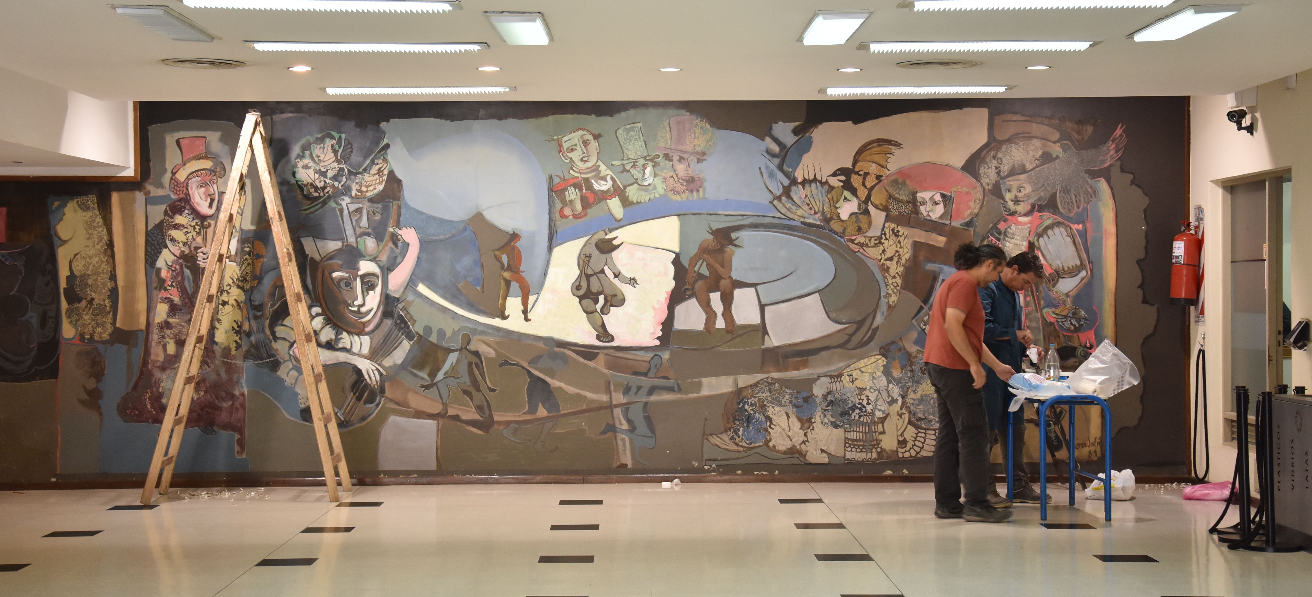 Aquellos juglares que llevaban su arte por los pueblos, cantando o bien narrando historias y fábulas de la realeza o de lo que acontecía en ese tiempo, usando máscaras o trajes extravagantes para la época, son los protagonistas del mural que recibe a los visitantes en el foyer del Teatro Sarmiento, pintado por el fallecido “Polo” Suárez Jofré en 1981. Denominado La alegría de vivir, hoy, la gran obra se encuentra en proceso de restauración a cargo de un equipo de especialistas del Museo de Bellas Artes Franklin Rawson, convocado por la Secretaría de Cultura de la Provincia, en el marco de la puesta en valor del Teatro Sarmiento, como anticipó DIARIO DE CUYO días atrás.