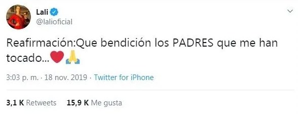Horas más tardes, sin aclarar nombres pero con una fuerte referencia, la presentadora de la premiere en Las Vegas posteó: "Reafirmación: qué bendición los padres que me han tocado", y sus fans lo leyeron como una respuesta a la mamá de Tini.
