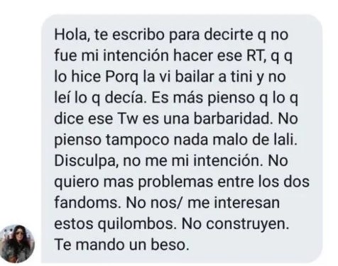 Los clubs de fans de cada una de las artistas se cruzaron en la red social y defendían a sus ídolas, por lo que Mariana debió salir a aclarar la situación: "No fue mi intención, lo hice porque la vi bailar a Tini, y lo leí lo que decía". "Pienso que lo que dice ese tuit es una barbaridad. No quiero más problemas entre los dos fandoms", escribió en un mensaje privado que envió a una fanática.