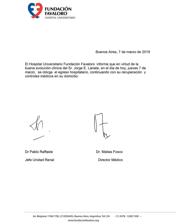"El Hospital Universitario Fundación Favaloro informa que en virtud de la buena evolución clínica del Sr Jorge E. Lanata, en el día de hoy, jueves 7 de marzo, se otorga el egreso hospitalario, continuando con su recuperación y controles médicos en su domicilio", dice el parte médico.