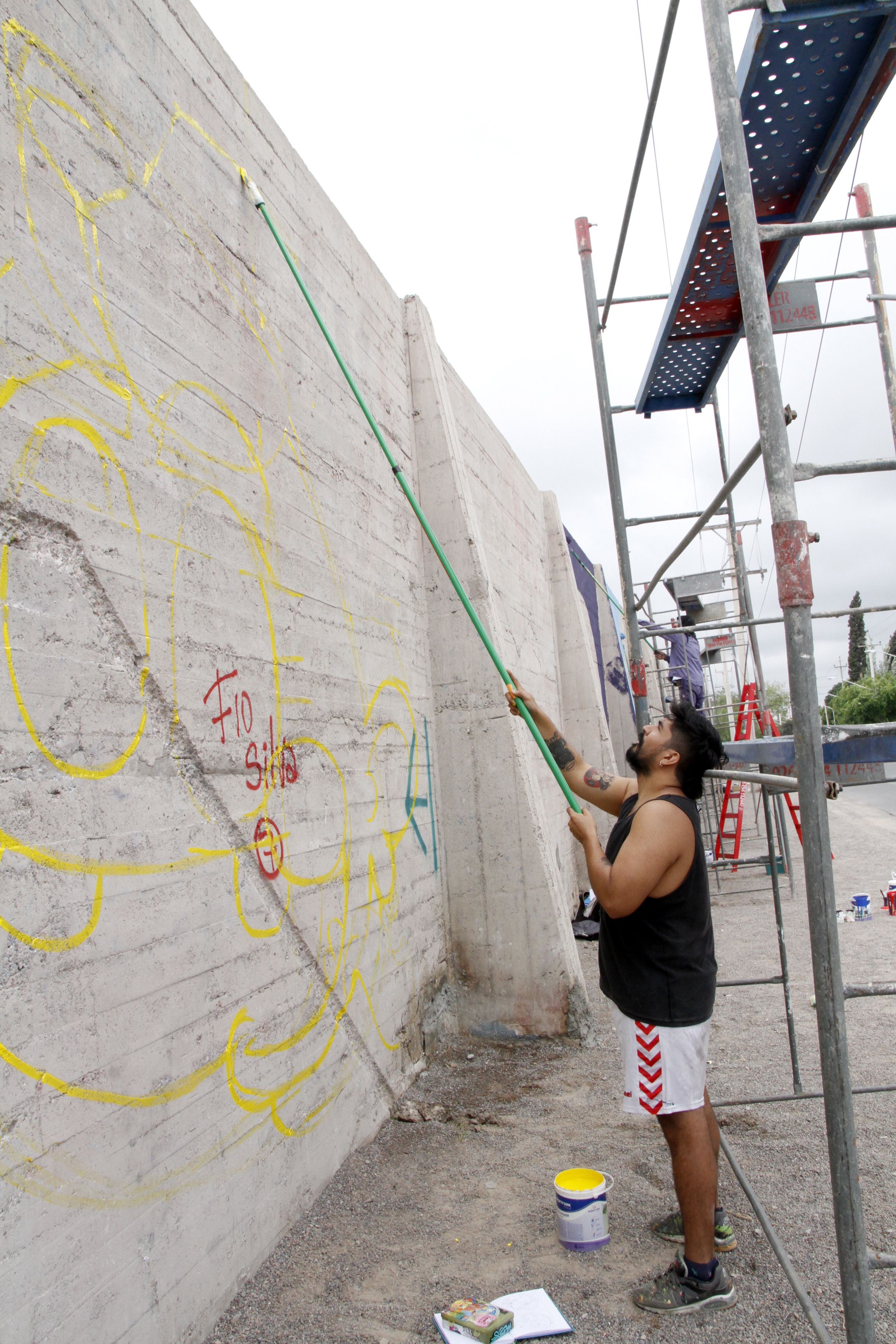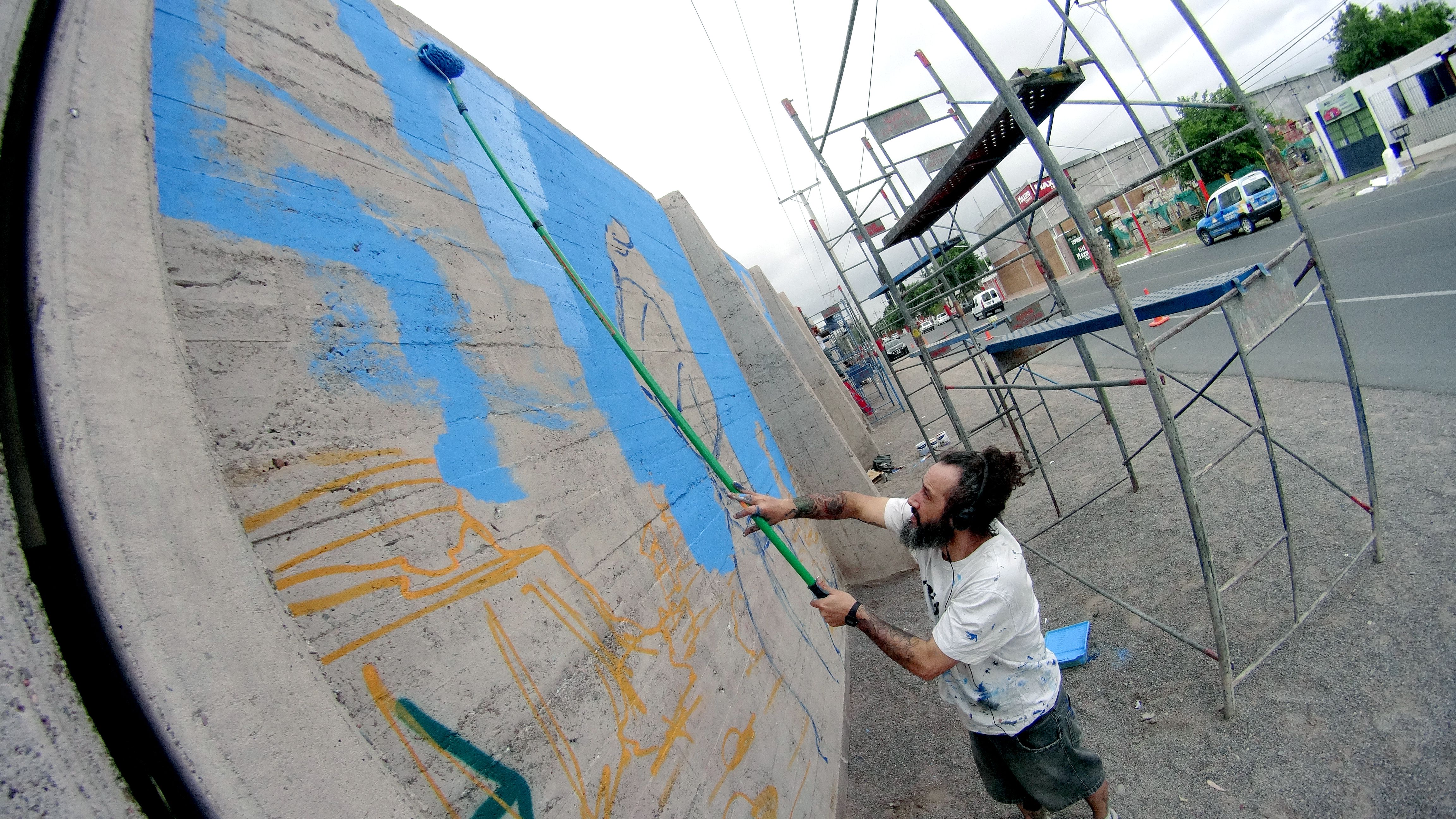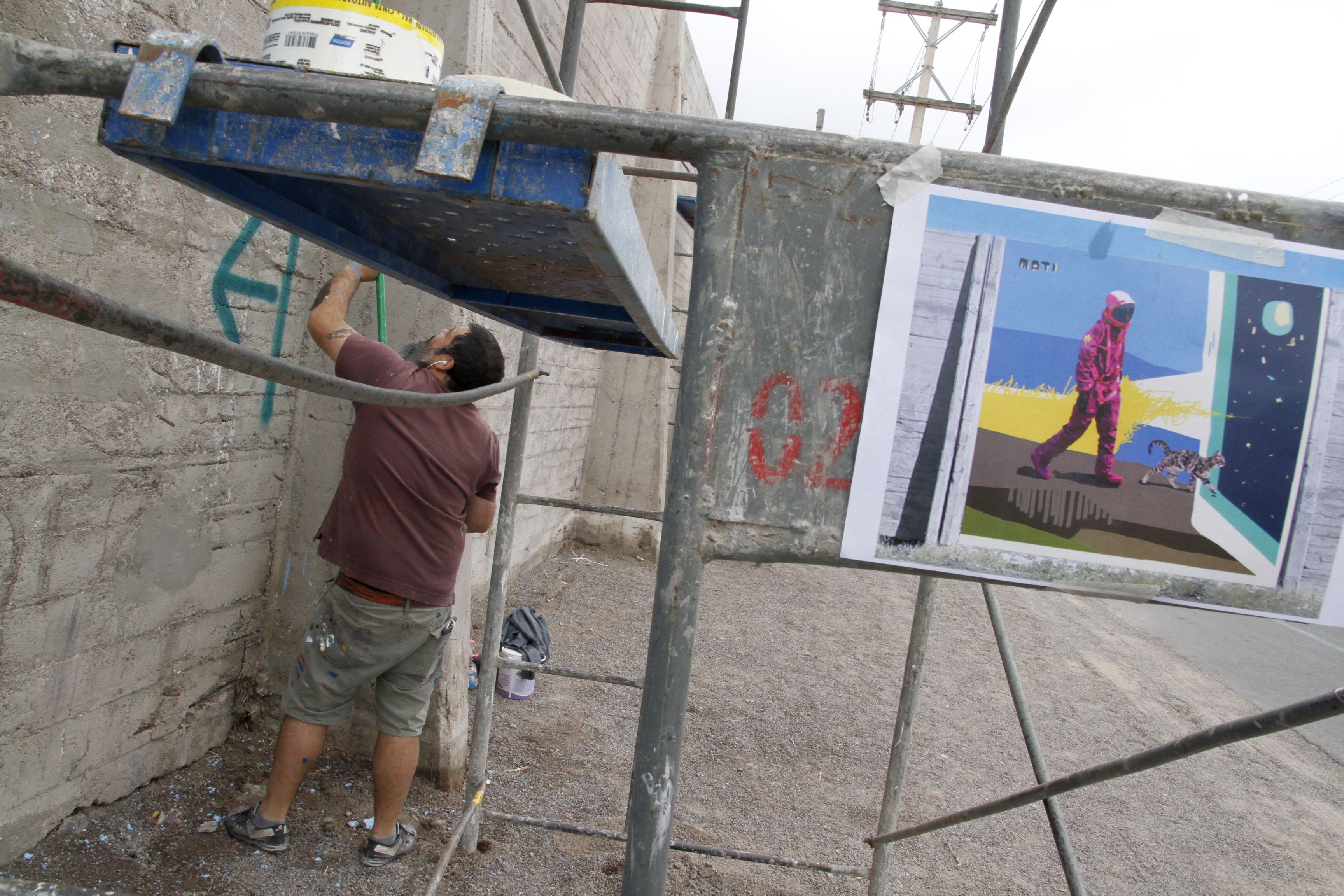Por su parte, Hernán Bruno, quien firma como "Grito", pintará un personaje con una cabeza de casa, sobre un paisaje desértico parecido al Valle de la Luna, con la mirada dirigida hacia un membrillo. "Salir a pintar es un hobby, no gano plata con el graffiti, es una forma de expresión que tengo. Además, pienso que embellecer y darle vida a un lugar, darle color, a la gente le gusta, se pone contenta", comentó el muralista de Buenos Aires.
