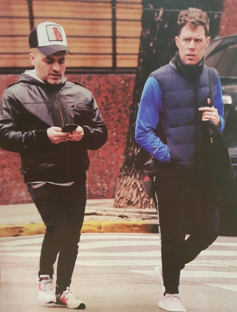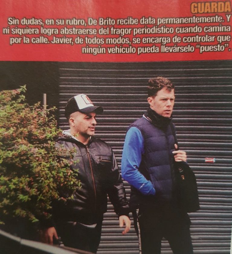 “Sin dudas, en su rubro, De Brito recibe data permanente. Y ni siquiera logra abstraerse del fragor periodístico cuando camina por la calle. Javier, de todos modos, se encarga de controlar que ningún vehículo pueda llevárselo ‘puesto’.”, describe la publicación una de las imágenes en la que se lo puede ver al conductor mirando su teléfono móvil.