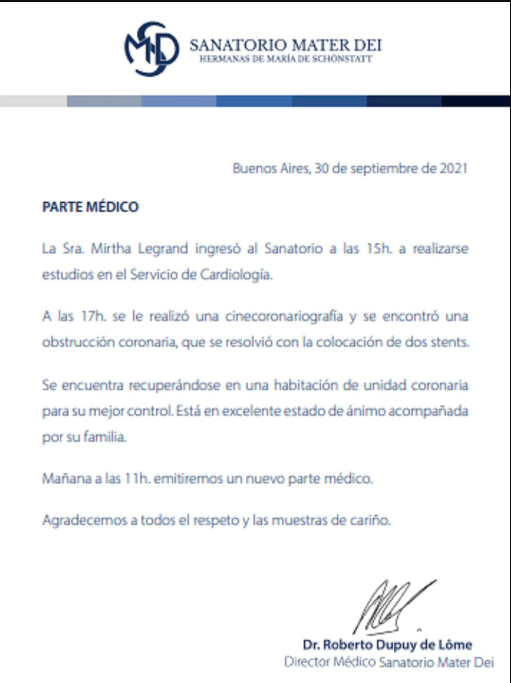 “A las 17 horas se le realizó una cinecoronariografía encontrándose una obstrucción coronaria, que se resolvió con la colocación de dos stents. Se encuentra recuperándose en una habitación de unidad coronaria para su mejor control. Está en excelente estado de ánimo compañada por su familia”, precisa el informe firmado por el doctor Roberto Dupuy de Lôme, director del Sanatorio Mater Dei.