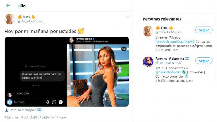Como su belleza y personalidad despiertan pasiones en cada rincón del país, un joven de 20 años llamado Nicolás Odetti –conocido en el mundo de las transmisiones por streaming y de YouTube- se la jugó y le escribió por mensaje privado de Twitter para consultarle cuántos likes necesitaba para que la rubia accediera a una cita con él.