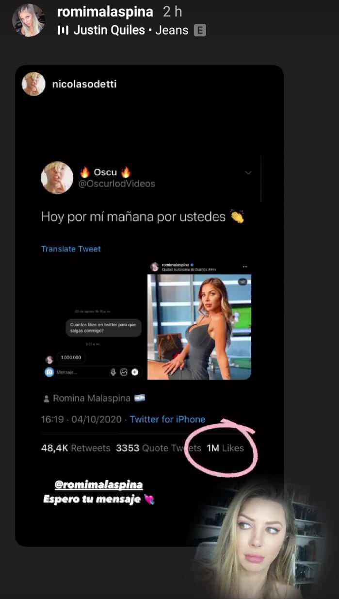 Con un par de historias en Instagram, Malaspina confirmó que va a cumplir con su palabra pero aclaró que por la ‘pandemia’ va a buscar alguna forma: “Esto no lo puedo creer, el otro día un chico me mandó un mensaje y me dice ‘Cuántos likes en Twitter para que salgas conmigo’. Yo mandé fruta y le dije un millón pensando que no iba a llegar ni cag…”, explicó.