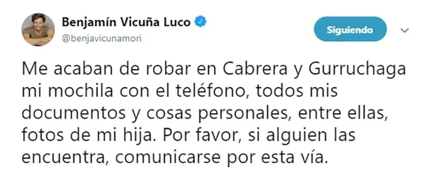 Benjamín Vicuña fue víctima de la inseguridad, como tantos otros ciudadanos. E hizo un pedido desesperado a través de su cuenta de Twitter, para rogar que si alguien encuentra sus pertenencias, se comunique con él. Porque, más allá de la bronca, hay cosas materiales que se pueden recuperar. Pero hay recuerdos que, lamentablemente, se pierden para siempre en manos de los delincuentes.