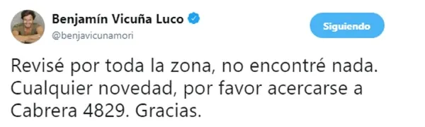 Minutos después en otro tuit escribió: "Revisé por toda la zona, no encontré nada. Cualquier novedad, por favor acercarse a Cabrera 4829. Gracias". A raíz de la denuncia del actor en sus redes sociales, se iniciaron actuaciones oficio a cargo de la Fiscalia Criminal y Correccional N° 54 a cargo de la Doctora Dora Olivieri.