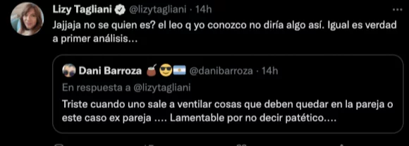 Luego de acusar a Lizy de ser infiel, Alturria afirmó como invitado al programa de Tucu López y Sabrina Rojas que fue él quien "la dejó" a la conductora, ganándose la reprobación y la bronca de los fans de la conductora. "Triste cuando uno sale a ventilar cosas que deben quedar en la pareja o este caso expareja. Lamentable por no decir patético…", señaló un usuario, a lo que Lizy le respondió con sinceridad: "No sé, ¿quién es? El Leo que yo conozco no diría algo así".