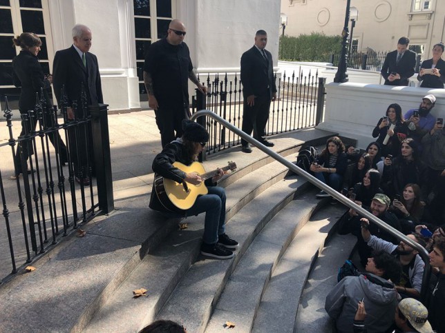 Cuando los medios se hicieron eco de la noticia de su presencia en Mendoza, muchos fanáticos se agolparon este mediodía en la puerta del Hotel Park Hyatt para lograr tener algún tipo de contacto con su ídolo. Finalmente, Mustaine se hizo presente con una guitarra acústica (pedida a Felipe Staiti, guitarrista de Los Enanitos Verdes) y se puso a tocar en la escalinata del hotel.