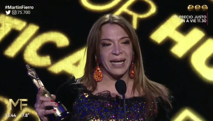 Y al finalizar su agradecimiento, levantó la estatuilla y, muy orgullosa de su trabajo, habló de su pasado: "Hoy acá me dan la oportunidad de demostrar que las mujeres no solamente somos mujeres trans, mujeres biológicas. Somos personas dispuestas a vivir y ser felices".