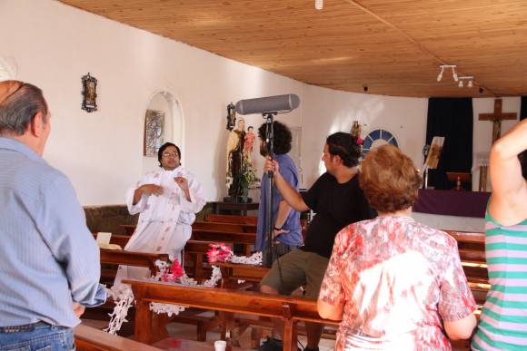 La primera jornada de trabajo fue extenuante, pero para el director, tuvo óptimos y gratificantes resultados. Desde las primeras horas de la mañana, se acondicionó lo mejor posible el interior de la capilla para hacer la celebración de un casamiento, en el que dos de los personajes protagónicos de Verónica Geréz y Esteban Bigliardi, estuvieron presentes. Quien dio la misa fue el propio sacerdote del lugar Daniel Meneses y en el papel de los novios, Mario Rubén Rivero y Julia Durán. Decenas de chicos y otros adultos formaron parte de la experiencia cinematográfica por primera vez en sus vidas y que nunca olvidarán. Hoy y mañana continuarán trabajando en la zona. Según los planes, hay 22 días de rodaje para esta producción en locaciones como Difunta Correa, Albardón, Talacasto y Encón. Luego quedará la edición y post producción en los próximos meses, por lo cual, su estreno sería en noviembre.