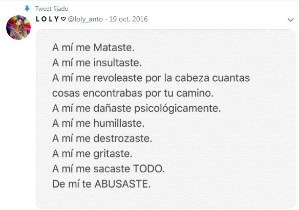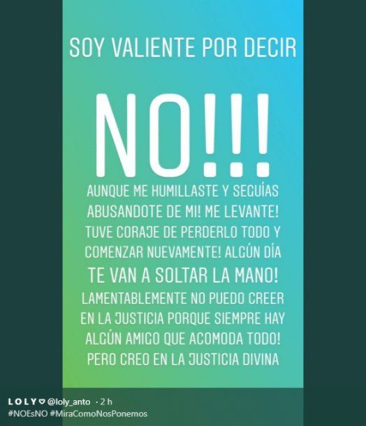 Y más contundente, agregó: “Soy valiente por decir ‘no’. Aunque me humillaste y seguías abusándote de mí, me levanté. Tuve coraje de perderlo todo y comenzar nuevamente. ¡Algún día te van a soltar la mano! Lamentablemente no puedo creer en la Justicia porque siempre hay algún amigo que acomoda todo, pero creo en la justicia divina”.