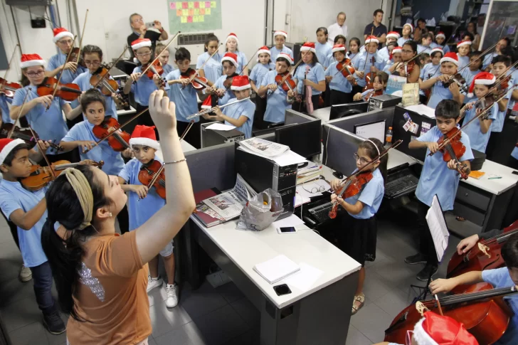 En la semana de Navidad, unos cincuenta alumnos de la Orquesta Escuela San Juan deleitaron a periodistas y directivos de DIARIO DE CUYO con un repertorio de temas de Mozart, Beethoven, el Himno a la alegría, para finalizar con una interpretación especial por parte de la directora Rosabel Mederos.