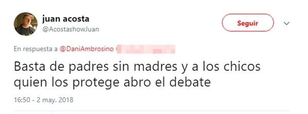 "Basta de padres sin madres, ¿y a los chicos quién los protege? Abro el debate",escribió Juan Acosta en su cuenta de Twitter, respecto a la decisión del periodista de Intrusos, Daniel Ambrosino, de convertirse en papá a través de la adopción.