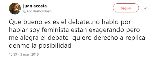 En ese momento Ambrosino se angustió y casi rompe en llanto, hasta que el mismo Rial se acercó a él para darle un abrazo. De inmediato Acosta usó su cuenta de Twiter para celebrar el dabate, dijo que estaban exagerando y que quería su derecho a réplica.