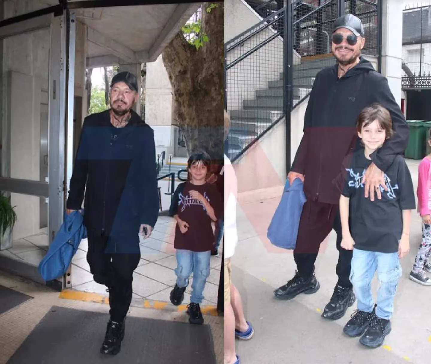 Marcelo Tinelli fue a la escuela con un estilo más casual y total black que consistió en jogging, buzo oversize, gorra, sneakers y anteojos. Estuvo acompañado por Lorenzo, su hijo menor, que llevó un jean claro y remera también oversize negra.