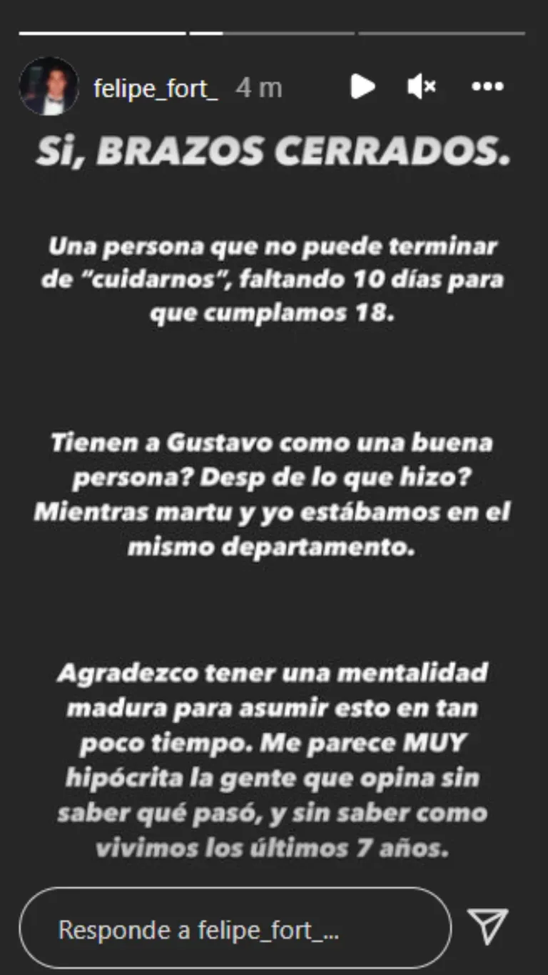 Acto seguido, publicó dos stories más, que luego borró. “Sí, brazos cerrados.. Una persona que no puede terminar de ´cuidarnos´, faltando 10 días para que cumplamos 18 ¿Tienen a Gustavo como una buena persona? ¿Después de lo que hizo? Mientras Martu y yo estábamos en el mismo departamento”, señaló. Y agregó: “Agradezco tener una mentalidad madura para asumir esto en tan poco tiempo. Me parece muy hipócrita la gente que opina sin saber que pasó y sin saber cómo vivimos los últimos siete años?”. Y cerró: “¿En qué cabeza cabe? 17 años tenemos”.