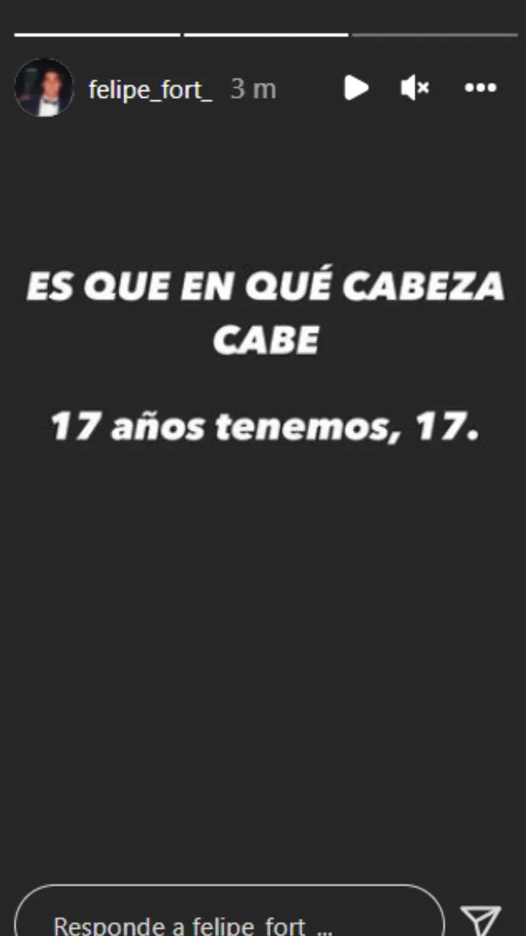 Luego de eliminar estas últimas dos stories, publicó un video en el que aclaró por qué lo hizo. “Sí, gente, yo subí unas historias. No me hackearon la cuenta. Fui yo, es lo que opino, esta situación…17 años tengo, piensen eso. Borré las historias porque…hay gente que piensa que me hackearon la cuenta cuando no es así, hay gente que opina lo contrario cuando no tienen idea de mi vida los últimos siete años, no tienen idea de lo que pasó tampoco”, aseguró. Y cerró: “No opinen, solo no opinen”.